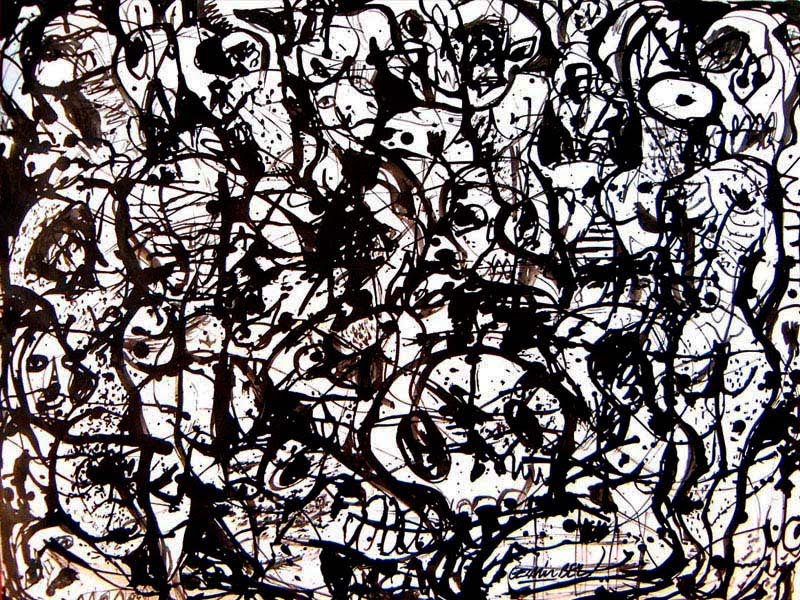 Por fin podía pintar todo eso que había visto por las calles (y no me refiero en absoluto a los escaparates bonitos, a los niños correteando por los parques, las bellas muchachas en mini falda o todo eso que la gente ata con cuerda de esparto, frágil y de tacto rudo, que se denomina equivocadamente, “LO BELLO”, me refiero a todo ese sufrimiento alegre que campa por cada una de nuestras caras, calles y avenidas, a todo lo visto hasta entonces con mi visión tuerta de poeta, a todas esas personas anónimas que van y vienen en la era contemporánea y que sin cruzar apenas miradas llevan muecas de soledad, angustia y decepción, POR DONDE QUIERA QUE VAYAS Y POR MUCHO QUE LOS VEAS REIR.
